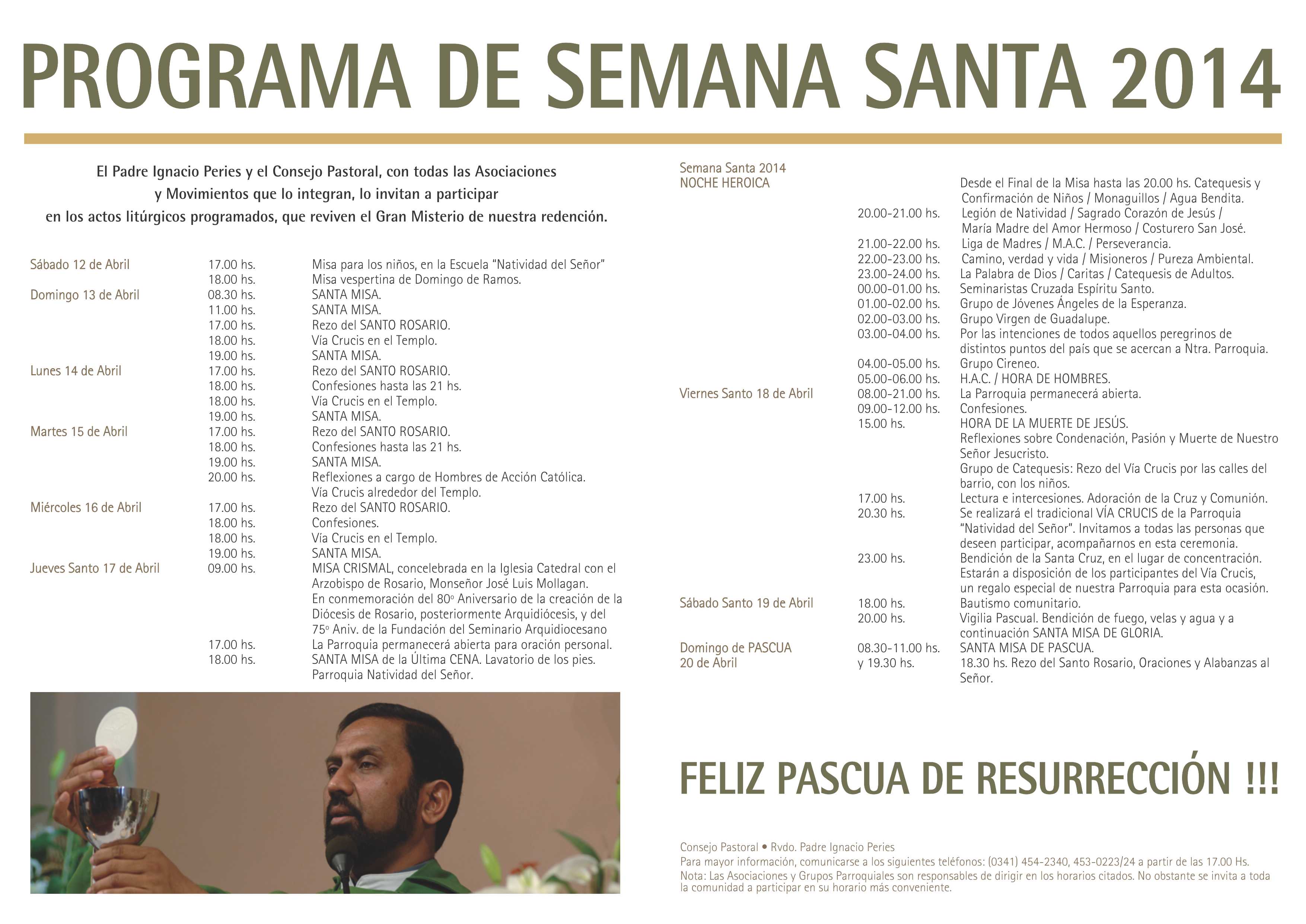 La Misa para los niños se realiza este sábado 12/4 a las 17 hs. en la Escuela Natividad del Señor. En la Parroquia Natividad del Señor, todas las misas del fin de semana son: Sábado 12/4 Misa vespertina de “Domingo de Ramos” a las 17.30 hs. Domingo 13/4 a las 8 hs., 10.30 hs. y a las 19 hs.